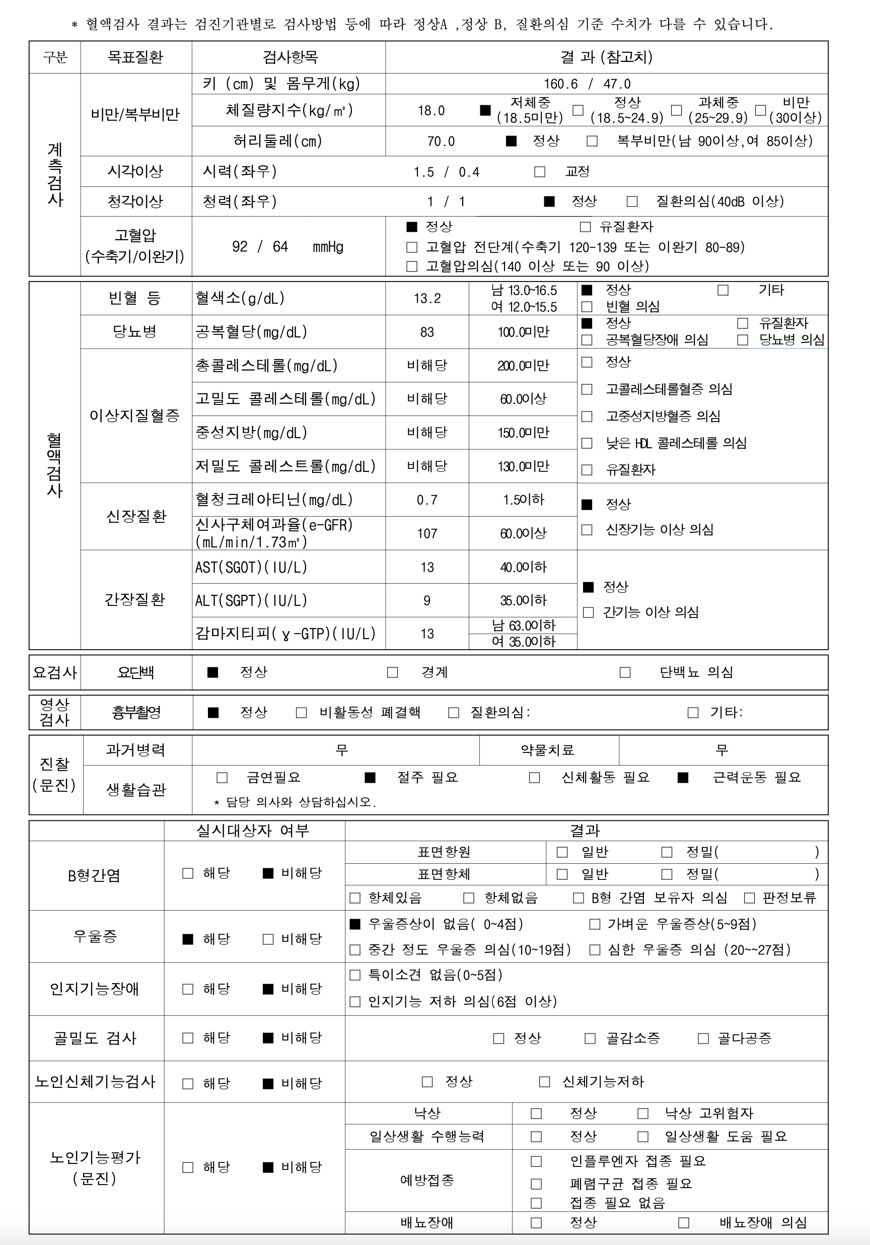 결과지에는 수치 옆에 참고치와 함께 정상·주의·비정상 표시가 함께 나오는 경우가 많습니다. 주의 또는 비정상으로 표시된 항목이 있다면 결과지를 들고 내과나 가정의학과를 방문해서 정확한 설명을 들어보시길 권합니다. 수치 하나만으로 단정 짓기보다 전체적인 흐름을 의사와 함께 확인하는 것이 가장 정확합니다.