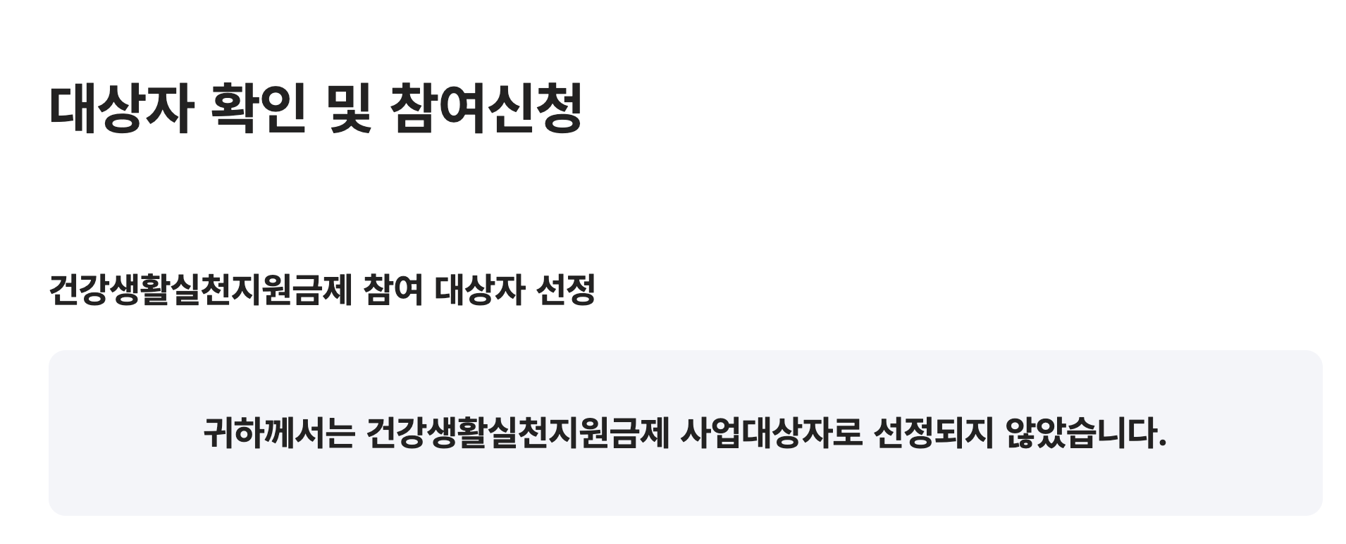 저같은 경우는 참여 대상자가 아니라서 "귀하께서는 건강생활실천지원금제 사업대상자로 선정되지 않았습니다." 라고 나옵니다. 저는 예방형 대상자의 조건이 되지 않아서인줄 알았는데, 저의 거주 지역인 '용인'은 해당 국민지원사업의 대상 지역이 아니기 때문에 아예 해당이 되지 않더라구요. 저희 아빠는 '관리형', 오빠는 '예방형'으로 신청할 수 있는 조건이 됐는데도 지역이 달라서 대상자에 해당하지 않습니다.
